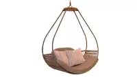 A base apresenta um trabalho refinado em corda náutica trançada, visível nas laterais e na parte inferior. O trançado é executado de forma manual e precisa, criando textura, movimento e valorizando o aspecto artesanal da peça. Esse detalhe não apenas embeleza, mas complementa a estrutura, reforçando a sensação de leveza e flutuação do balanço.