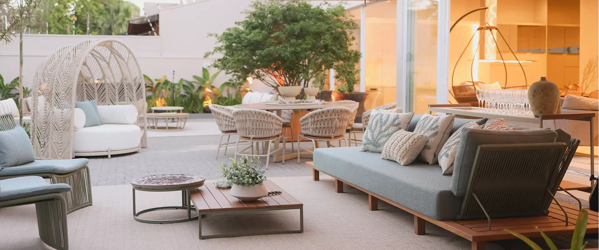 A base em cumaru com superfície ripada em madeira maciça, funciona não apenas como apoio funcional, mas também como elemento decorativo, tornando o sofá mais versátil e adaptável a diferentes composições de ambiente. O encosto combina estrutura em alumínio com um sofisticado trabalho em corda náutica, trançado de forma manual e precisa, resultando em um visual geométrico, moderno e extremamente elegante.