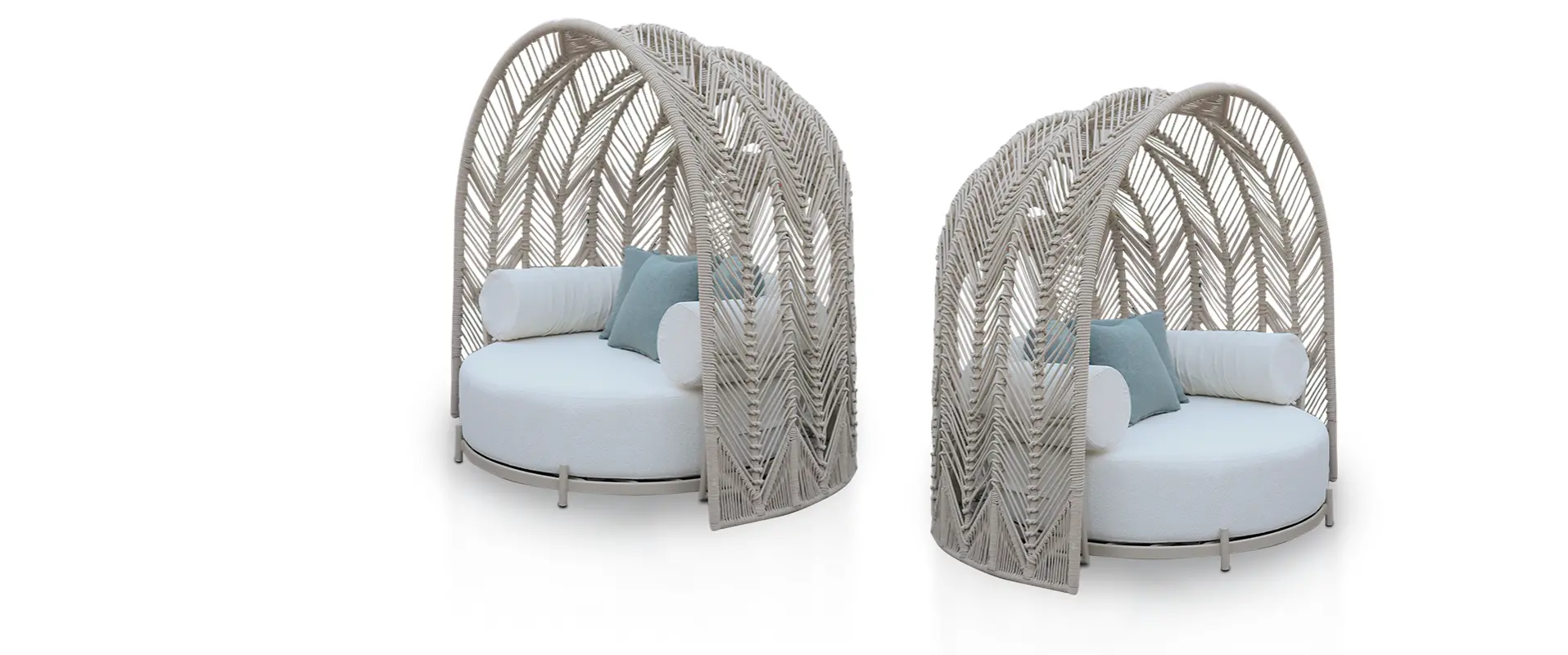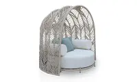 Com design orgânico e estrutura imponente, a peça combina base estofada ampla e confortável com uma cúpula envolvente tramada em corda náutica, que proporciona privacidade, leveza visual e um toque artesanal sofisticado.