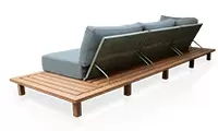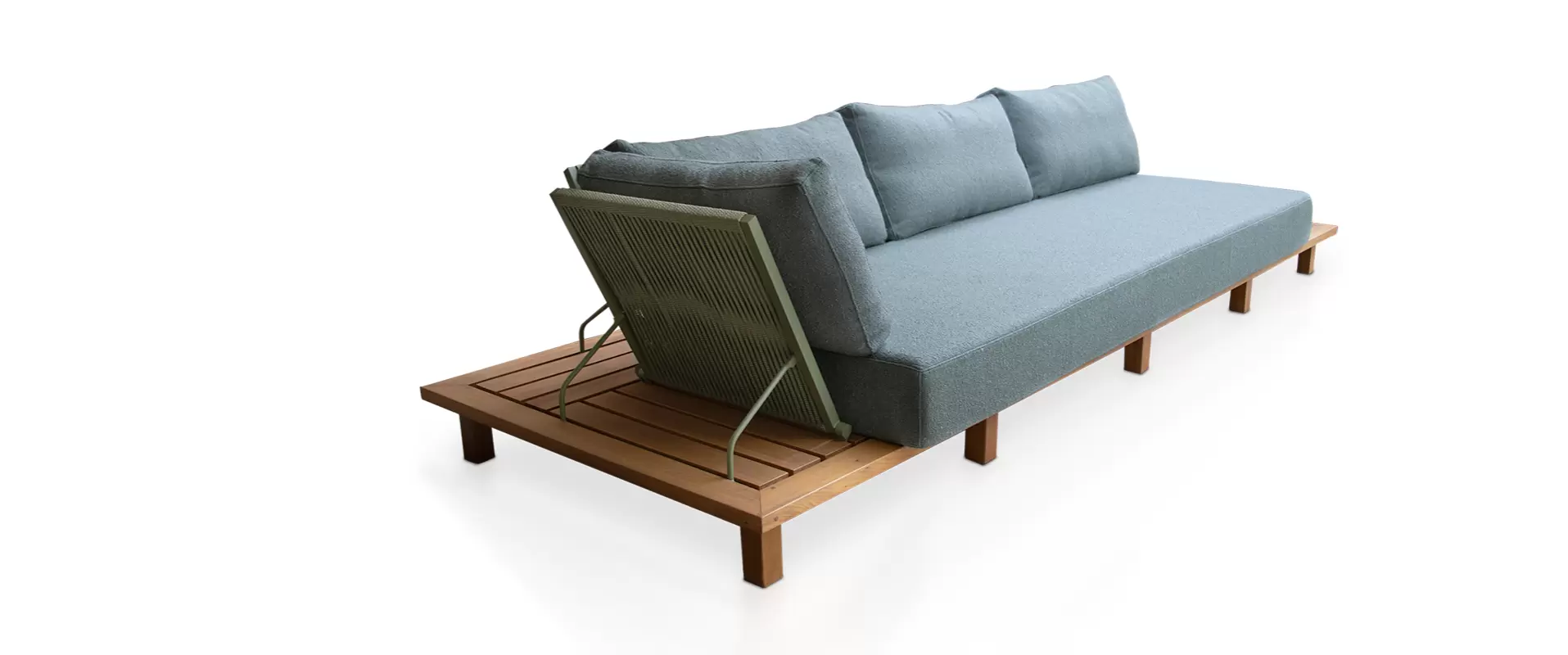 A base em cumaru com superfície ripada em madeira maciça, funciona não apenas como apoio funcional, mas também como elemento decorativo, tornando o sofá mais versátil e adaptável a diferentes composições de ambiente. O encosto combina estrutura em alumínio com um sofisticado trabalho em corda náutica, trançado de forma manual e precisa, resultando em um visual geométrico, moderno e extremamente elegante.